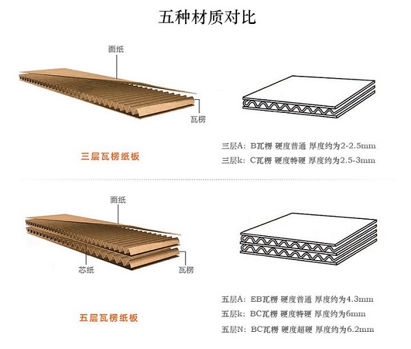 單坑 3±1MM 常用表達方式:K3K,K3A,A3A……… 雙坑 6±1MM 常用表達方式:K=K,K=A,A=B 三坑 9±1MM 常用表達方式:K三K,K#K都可以 備注:611+T 為雙坑材質紙板,厚度為6MM.表紙為6紙(6紙要比A紙差一點),底紙為T紙(T紙比B紙要差點).這種紙質常用來代替A=B.Y11+Y也是同理,只不過,它是用來代替K=K的.K2L,Y+1+Y為單坑材質紙板,厚度3MM,分別用來代替K3A和K3KK=A指的是:面紙K紙,底紙A紙,雙楞的5層紙板.數字是指幾層紙板,3就是三層紙板,又叫單瓦楞紙板,5就是5層瓦楞紙板,又叫雙瓦楞紙板,7是7層瓦楞紙板,又叫三瓦楞紙板,以此類推……